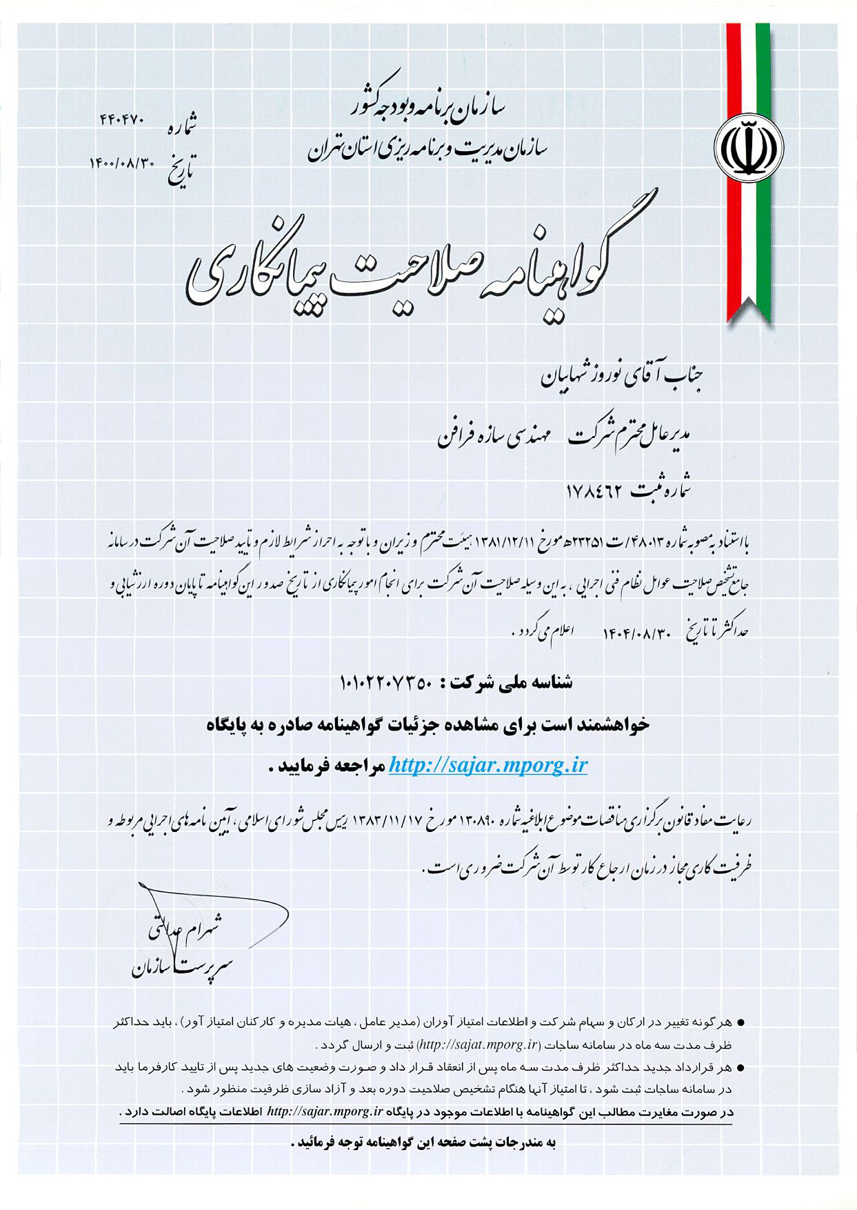 Farafan Structural Engineering Company has also been ranked as one of the oil engineering and development services in the field of consulting and engineering services and workshop supervision of oil engineering and development.